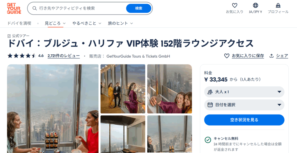 「ブルジュ・ハリファ ラウンジ」と検索すれば、152階へアクセスできるチケットが出てくるので、それを購入するだけです。
