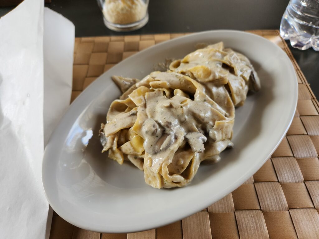 お昼時なので、飲食店を探しつつメインストリートを散策。看板にラザニアって書いてあるお店を見つけ、テラス席に案内書してもらいました。