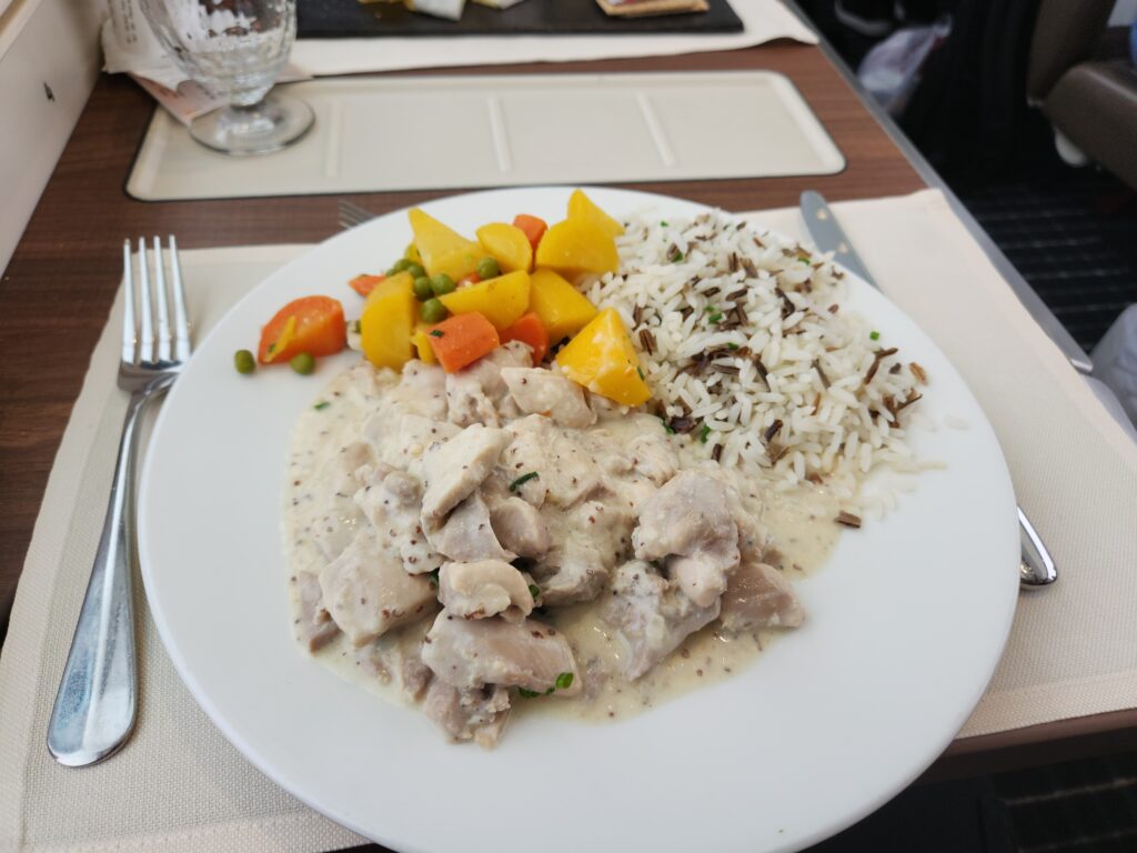 2品目は鶏肉のクリーム煮と野菜の付け合わせ、それからワイルドライスというワンプレートでした。
