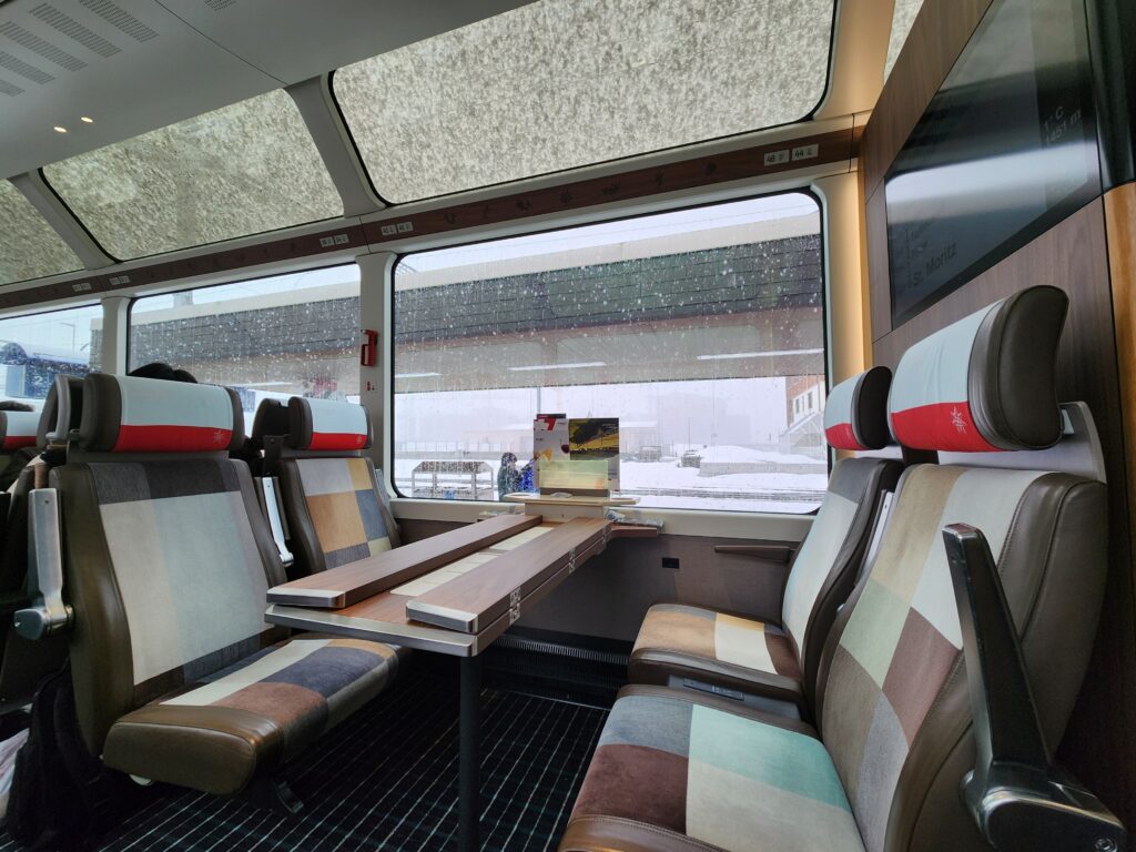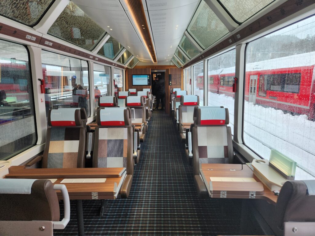 横も上もでかいガラス張りになっていて、さすがパノラマ鉄道という感じ。天気が悪くてもめっちゃ明るい雰囲気でした。