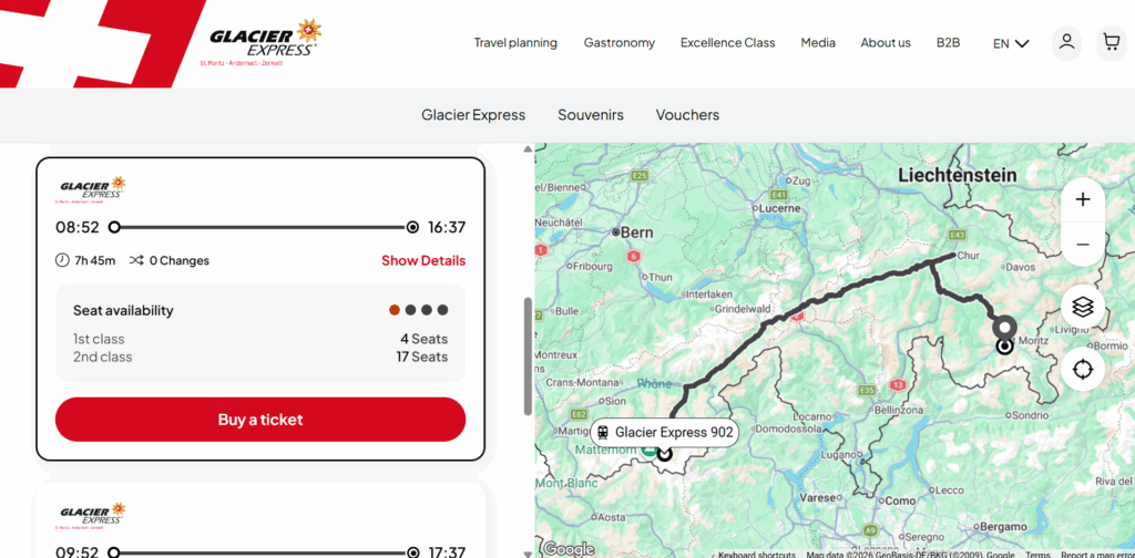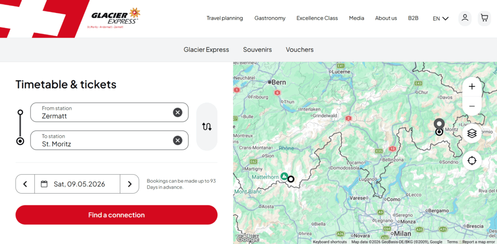 今回は、氷河急行の全運行区間である、Zermatt駅(ツェルマット)からSt.Moritz駅(サンモリッツ)まで、2026年の5月9日(土)に乗車する場合を例に挙げて進めていきたいと思います。