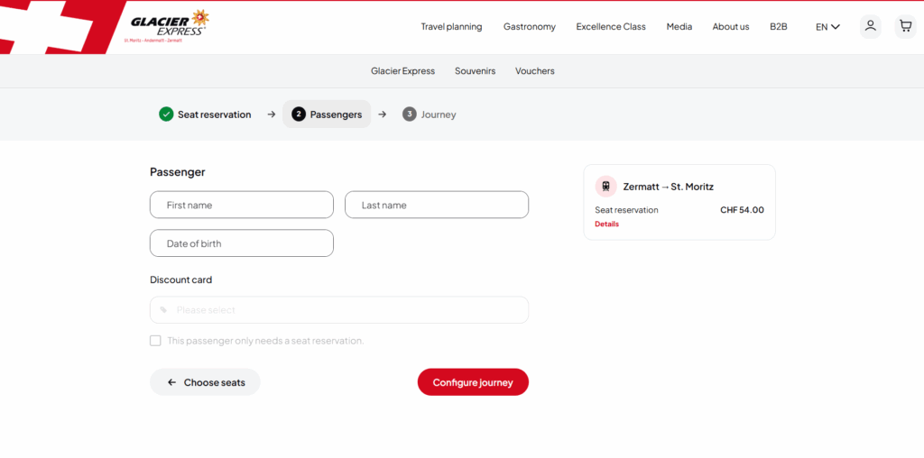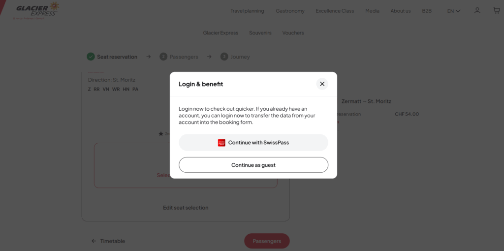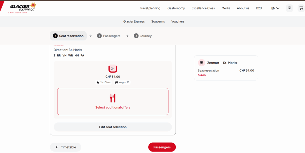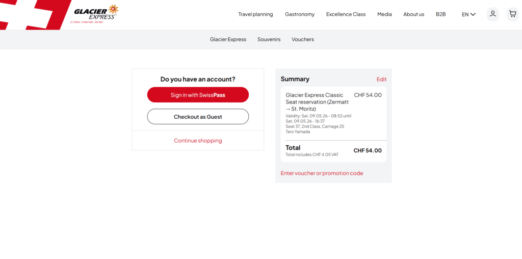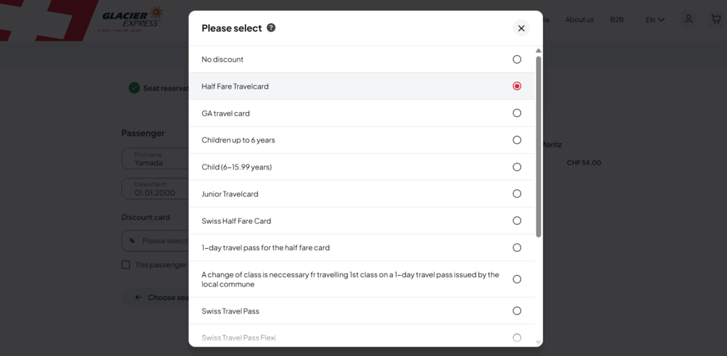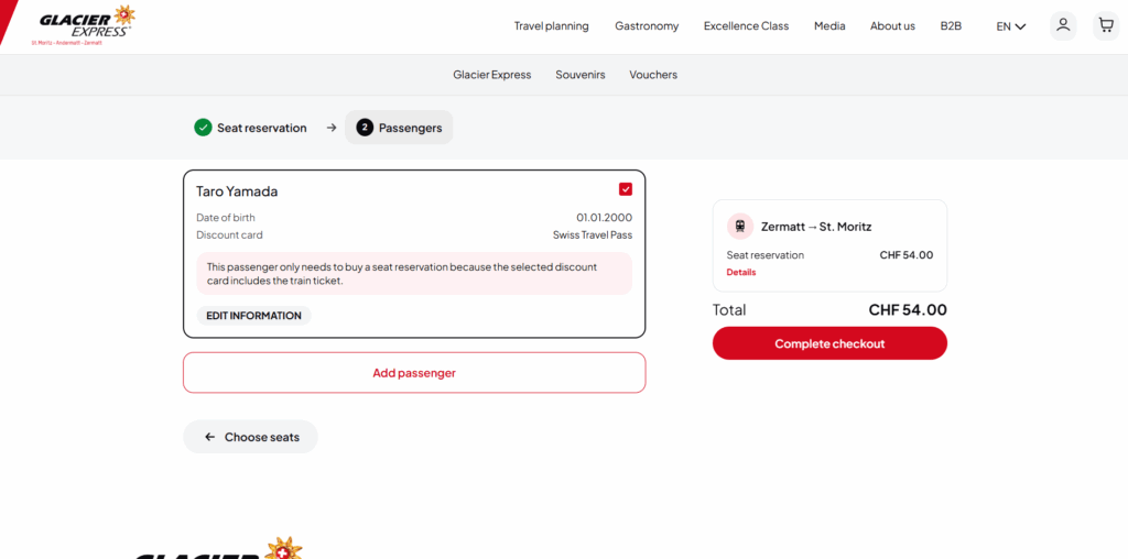 スイストラベルパスを持っている場合は、「Swiss Travel Pass」を選択します。この場合、乗車区間の乗車券(氷河急行の座席とは別の、運賃のことです)が免除されますので、54CHFの座席料金のみで乗車することが出来ます。