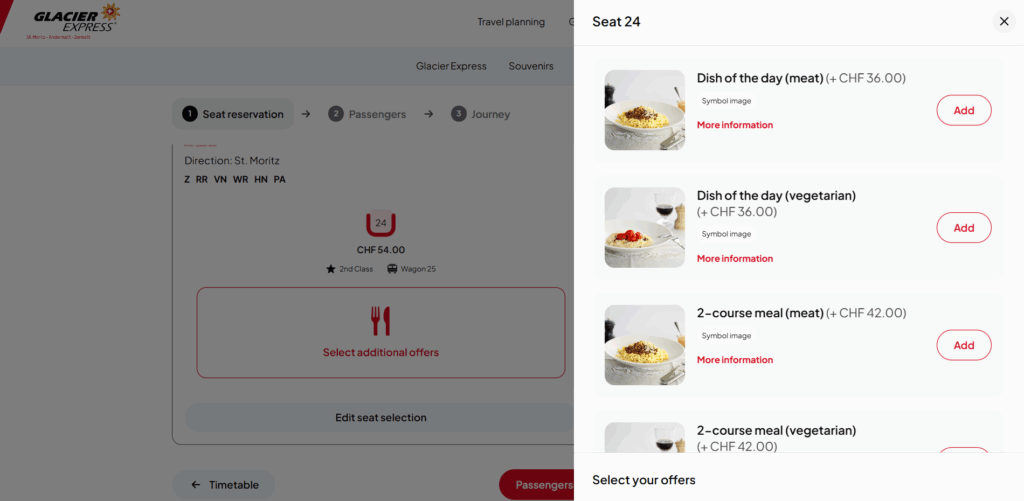 時刻表が左側に表示されますが、この日はAM8:52に氷河急行が走っていますね。これを予約していきたいと思います。(氷河急行は1日2本走っていて、基本的に時間は変わりません)