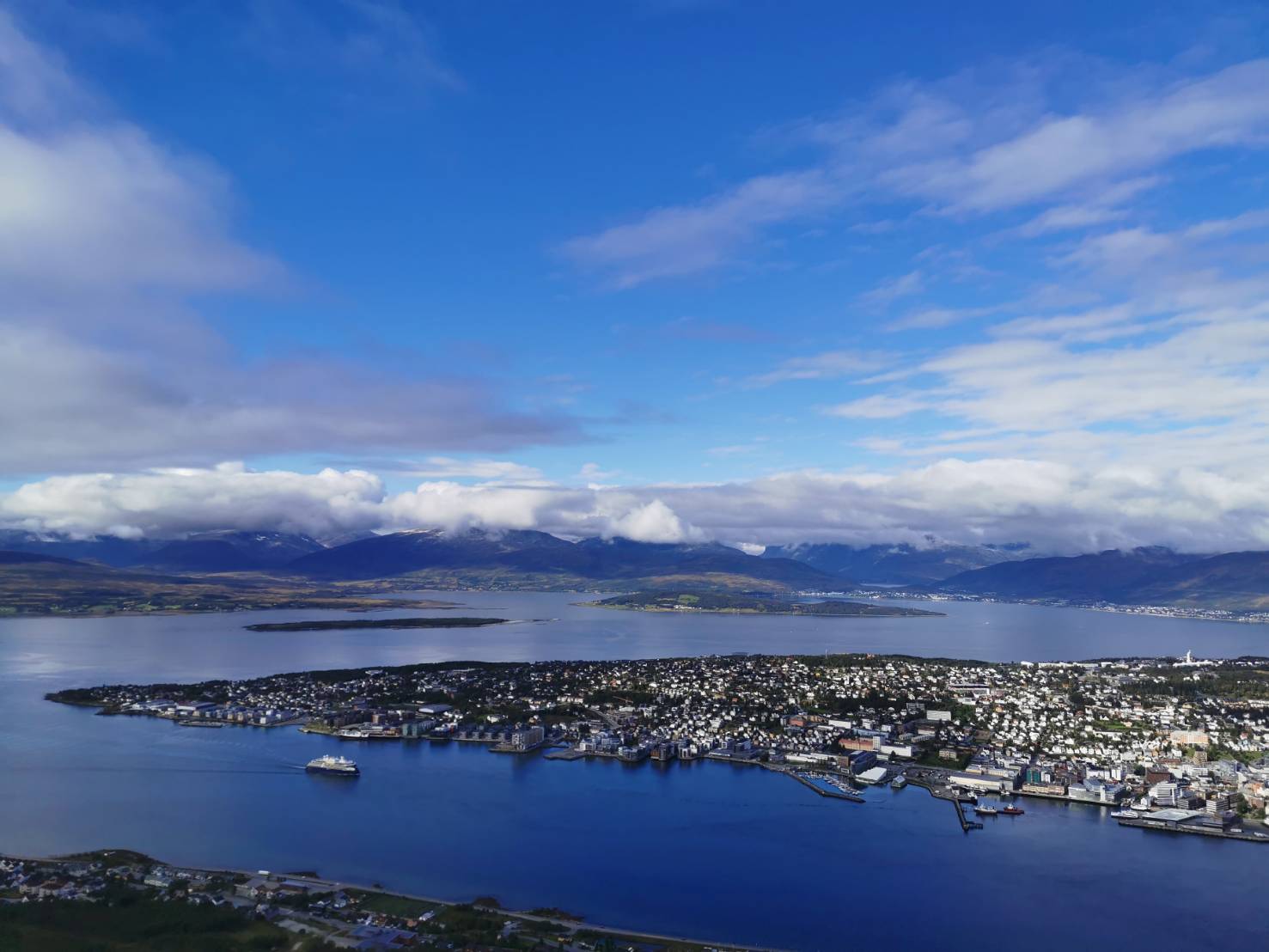 山の上はハイキングコースになっていて、めちゃくちゃ広々としています。そしてトロムソ市街地のほうを振り返るとこんな感じ!晴れ間も出てきてトロムソを一望することが出来ました。